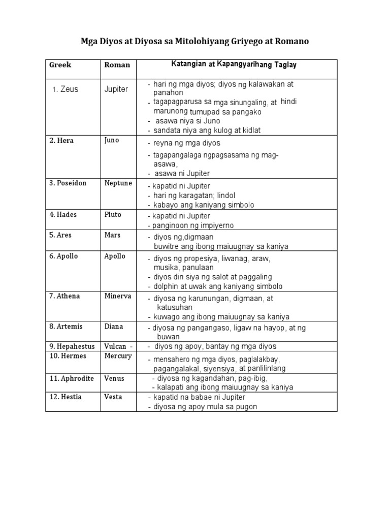 Tinatawag na diyos ng propesiya liwanag araw musika panulaan. AthenaMinerva-Diyosa ng karunungan digmaan at katusuhan-kuwago ang ibong maiuugnay sa kanya. Kakambal ni Apollo ang isa pang diyos na si Artemis na diyos naman ng pangangaso.